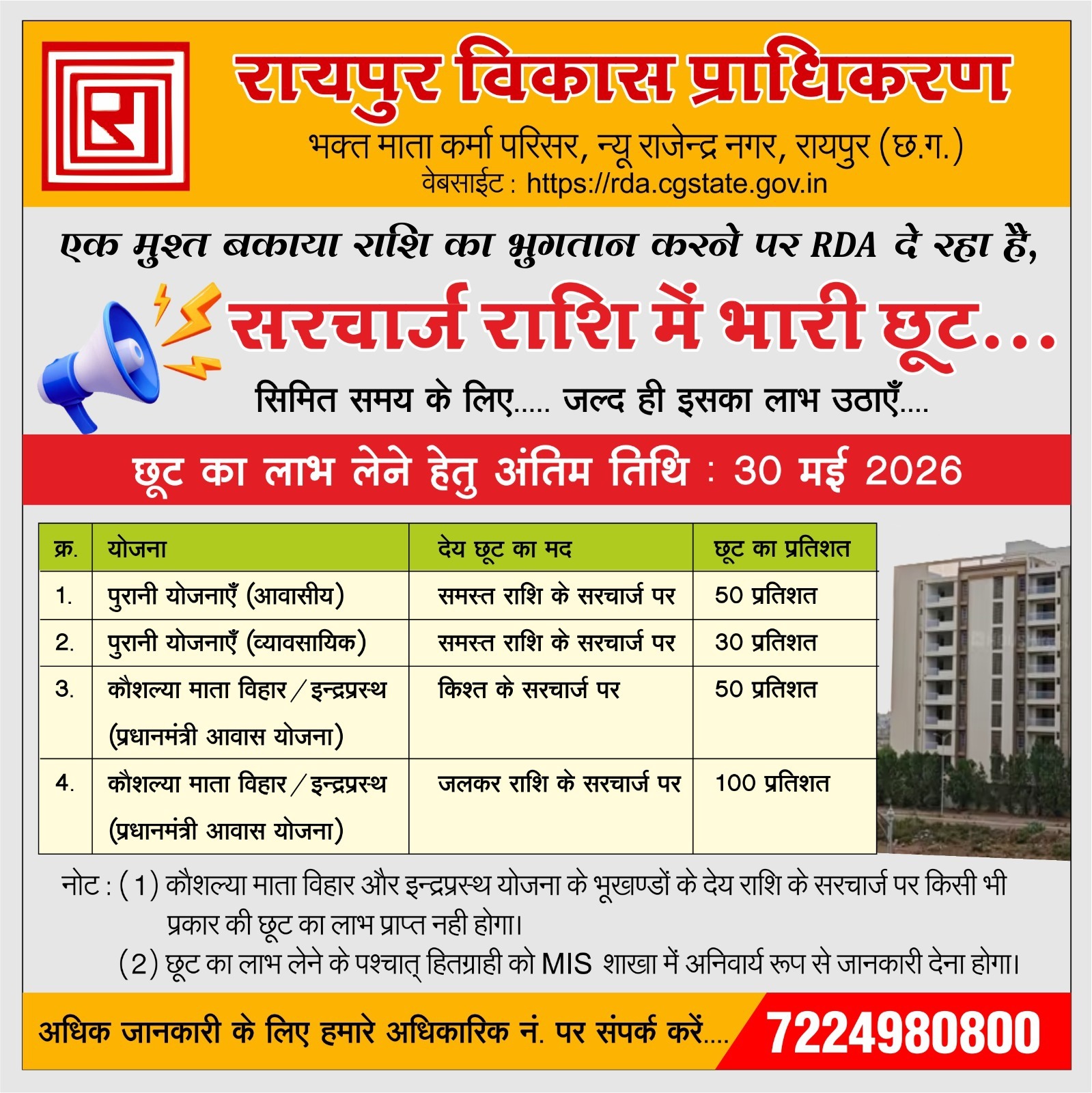 Special Rebate on Surcharge till 30 May 2026Final Claim Objection NoticeRegarding New Swagat ViharSecond Tender Invitation NoticeClaims/objections for applications submitted in Kaushalya Mata Vihar Sector 1, 4, 11B, 14A EWS (2 BHK) and Indraprastha Phase-02 Raipura EWS (1 BHK) will be accepted till 16.01.2026